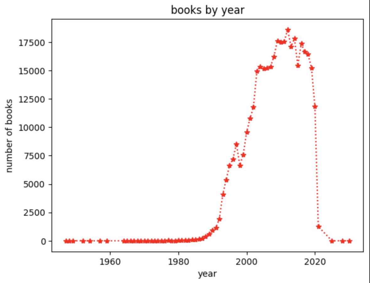 plt.plot(count_by_year,marker = '*', linestyle = ':', color = 'red')