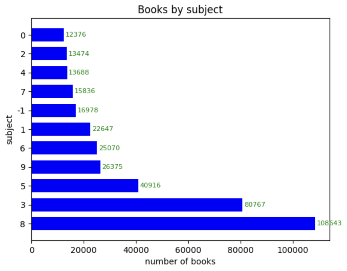 plt.barh(count_by_subject.index, count_by_subject.values, height=0.7, color='blue')