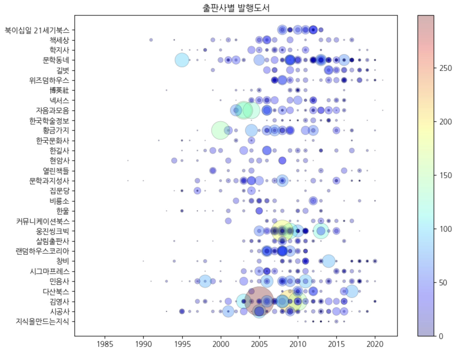 ax.scatter(ns_book8['발행년도'], ns_book8['출판사'], linewidths = 0.5, edgecolors = 'k', alpha=0.3, s = ns_book8['대출건수']*2, c=ns_book8['대출건수'])